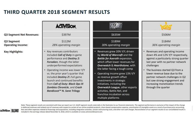 Activision Blizzard today released its financials for its third quarter ended September 30, stating that its results were better than predicted despite showing a decrease in total revenue and overall player engagement.