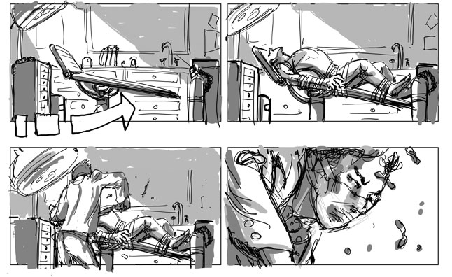 Our original intention with our cinematics was to create a distinct visual style that was also efficient to develop. To that end, we settled on an effect that combined 3D models in freeze-frame poses along with camera jittering and distortion effects. It was effective and efficient. With this in mind, the resources we set aside for cinematic development were limited in scope.