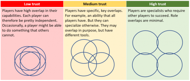 For curious devs, Koster suggests a sports team as a good example of players connected via high-trust relationships. Players train together and work out strategies with each other, so that when the time comes to perform they trust each other to be where they need to be and play their roles.
